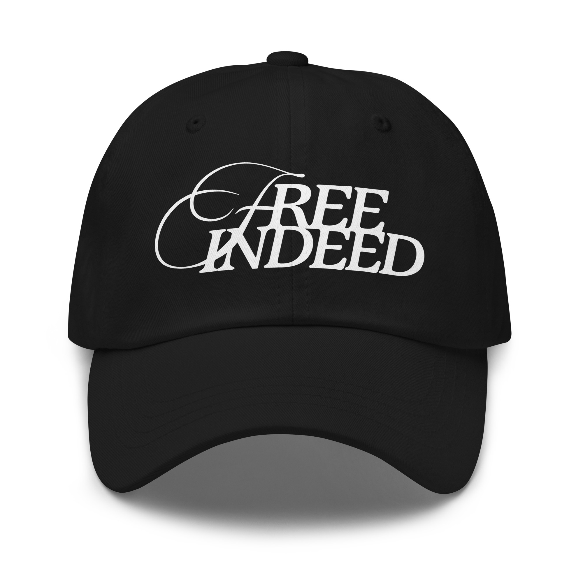 Black Free Indeed baseball cap with low profile, adjustable strap, and curved visor.